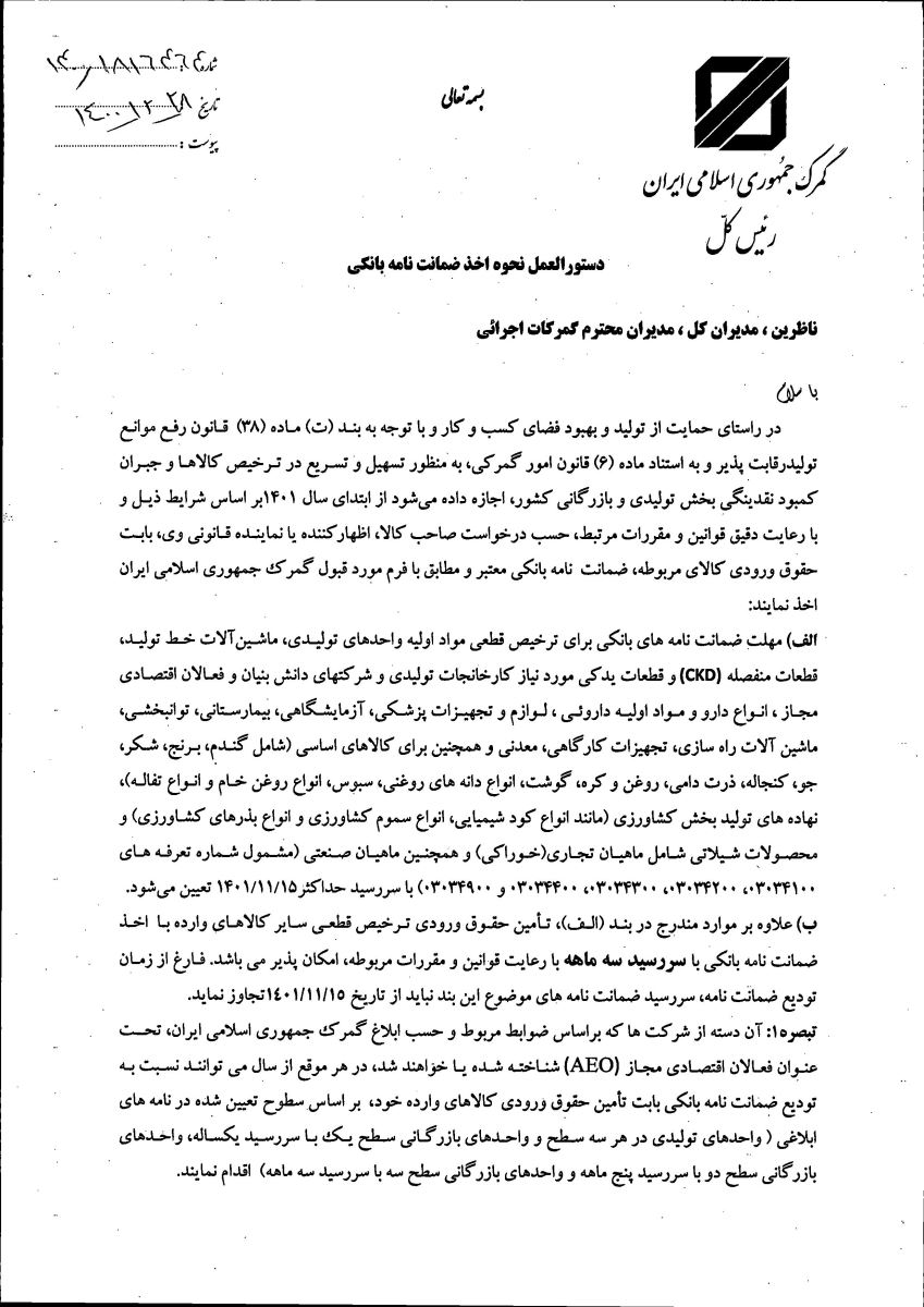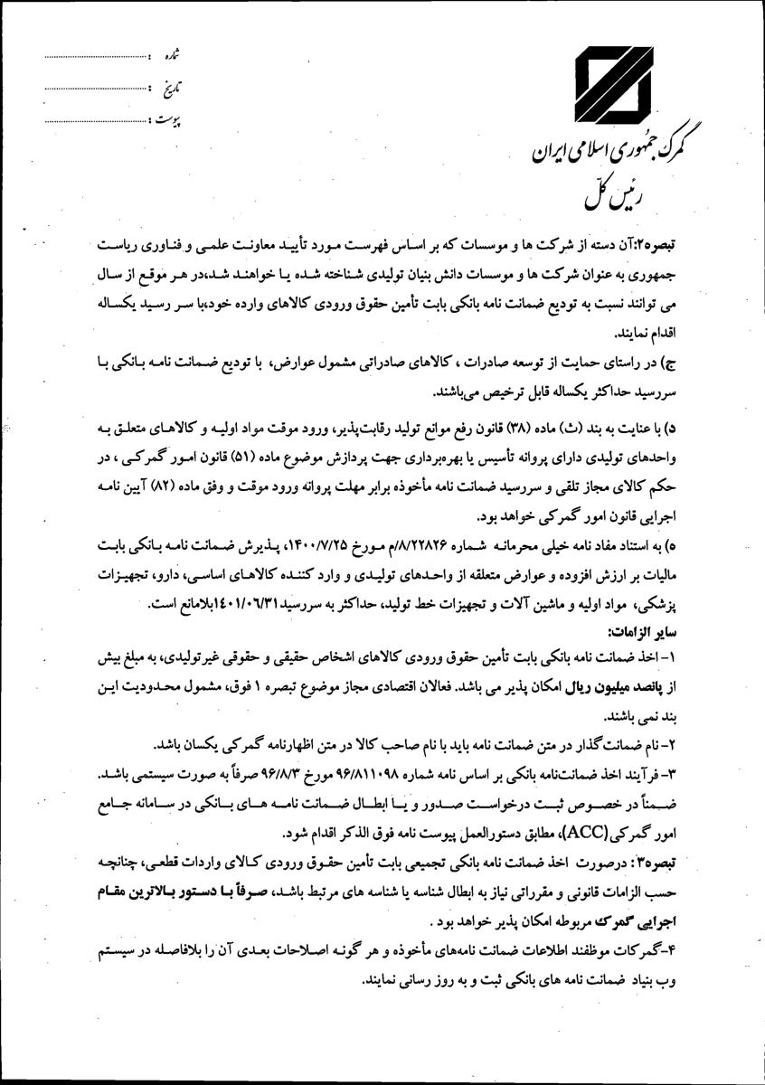 ضمانت نامه حقوق ورودی موضوع ماده ۶ قانون امور گمرکی و مالیات بر ارزش افزوده جهت واحدهای تولیدی، بازرگانی و فعالان مجاز اقتصادی در سطوح مختلف و شرکت های تولیدی دانش بنیان، به منظور حمایت از تولید اعلام شد.