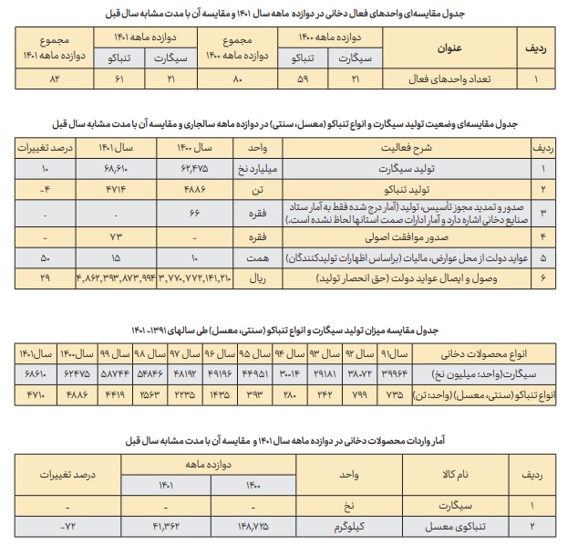 تعداد واحدهای فعال در تولید انواع سیگارت در سال 1401 بیست و یک واحد بود که نسبت به سال ماقبل تغییری نداشت. همچنین در سال 1401 تعداد واحدهای فعال در تولید انواع تنباکو 61 واحد بود که نسبت به سال ماقبل 2 واحد افزایش نشان میدهد. کل تولید انواع سیگارت در سال 1401 به میزان 68،610 میلیارد نخ بود که ده درصد معادل 6،14 میلیارد نخ نسبت به سال قبل افزایش داشت. میزان تولید انواع تنباکو اعم از سنتی و معسل هم 4714 تن بوده که 4درصد نسبت به سال قبل کاهش نشان میدهد.