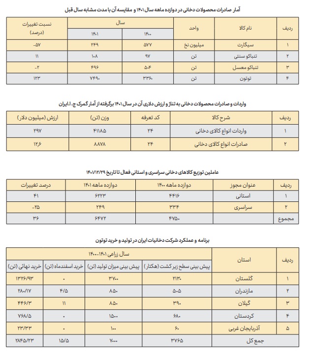تنباکوی خریداری شده هم توسط شرکت دخانیات ایران در سال 1401 به مقدار 402 تن بوده که در مقایسه با میزان پیش بینی که 750 تن بود به مقدار 348 تن یعنی 46 درصد کمتر است. میزان توتون و تنباکوی خریداری شده توسط سایر فعالین حوزه کشاورزی و غیر از شرکت دخانیات ایران در سال 1401 به میزان 5887 تن بوده است.