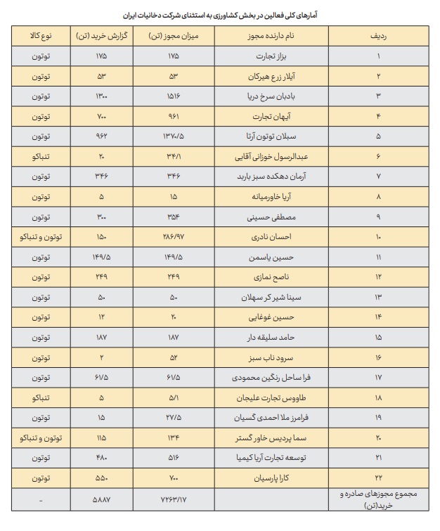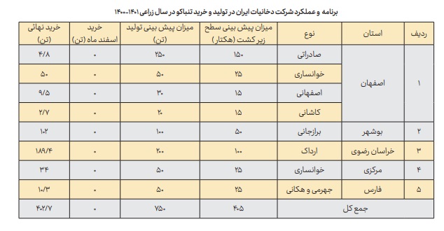 برنامه خرید انواع توتون توسط شرکت دخانیات ایران برای سال زراعی 1401-1400 به میزان 7000 تن بود که از این مقدار 2845 تن خریداری شد. به عبارتی شرکت دخانیات ایران 4155 تن یعنی حدود 60 درصد کمتر از برنامه و تعهدات خود از کشاورزان توتون خریداری کرد.