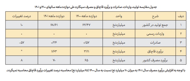 هر چند مقدار واقعی قاچاق سیگارت مشخص نیست و از مابهالتفاوت تولید و برآورد مصرف تخمین زده میشود، بر این اساس و با فرض برآورد مصرف 70 میلیارد نخ و 68،6 میلیارد نخ تولید و 240 میلیون نخ صادرات، قاچاق انواع سیگارت در سال 1401 به میزان 1،63 میلیارد نخ تخمین زده میشود. این برآورد برای سال 1400 معادل 3،11 میلیارد نخ بوده است.